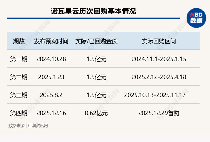 每经资本眼研究员通过梳理其回购历史发现,诺瓦星云不仅回购频次高,执行效率也极为突出,已完成的前三期回购周期均不超过三个月,且全部顶格完成。其中,2025年8月发布的第三期回购方案,实际回购区间为10月13日至11月17日,月余时间便完成1.5亿元顶格回购。截至2025年12月底,其12月发布的第四期回购方案已正式启动,累计回购0.62亿元。