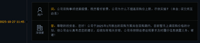 早在去年10月底,就有投资者指出其回购进展缓慢,提问公司为何不提高回购价格上限,公司当时明确表示暂无相关计划。目前来看,想要按时完成回购计划难度较大,公司后续会如何处理回购事项呢?每经资本眼研究员以投资者身份致电深信服董秘办,相关工作人员表示,公司已经关注到(相关问题),后续会有动作,但具体安排暂不便透露。